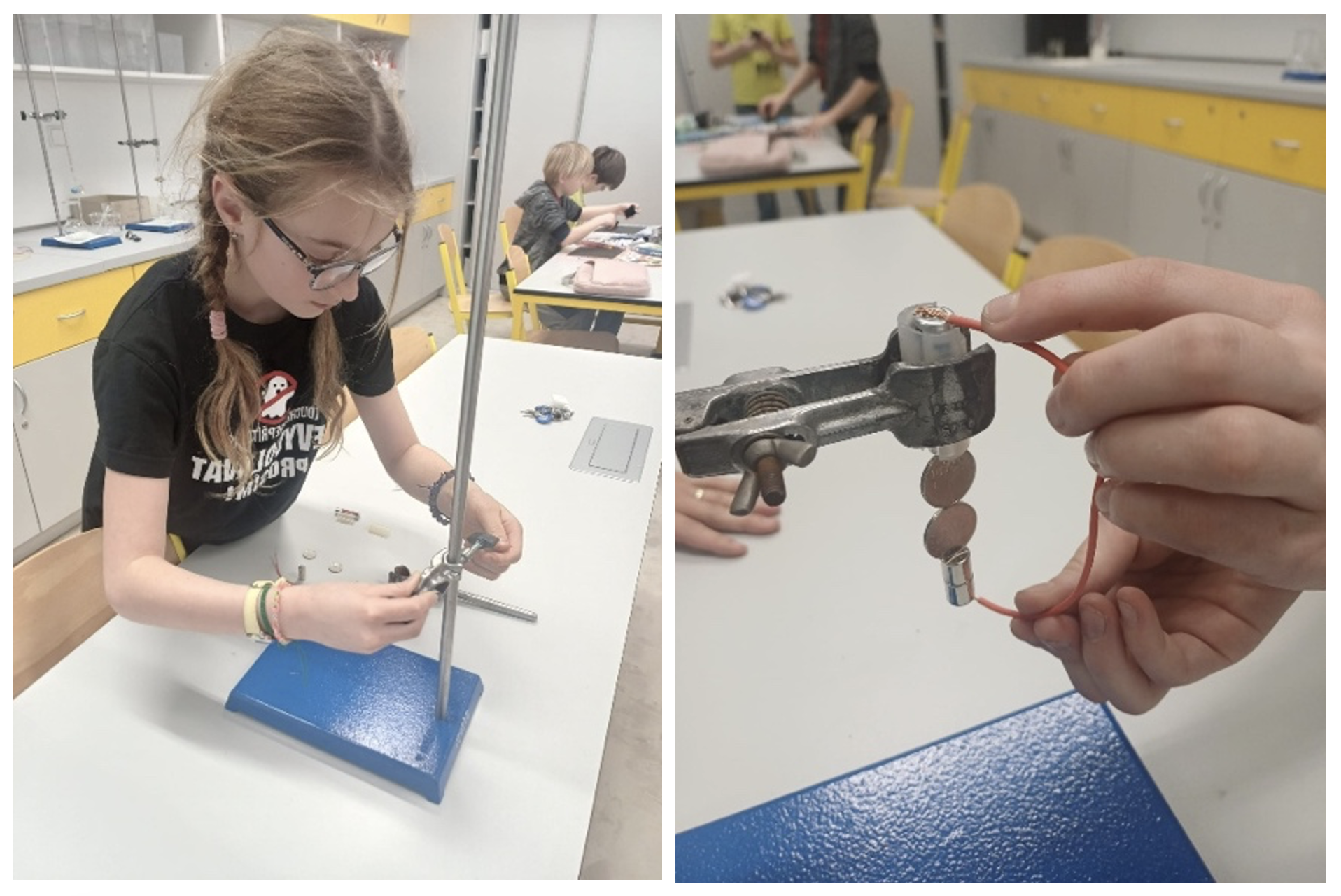 V experimentální části měli představit fyzikální či chemický pokus, ve kterém využijí mince. Naši malí koumáci sestrojili jednoduchý elektromotor z baterie a dvou neodymových magnetů. Po jejich propojení se mince umístěná mezi magnety roztočily.